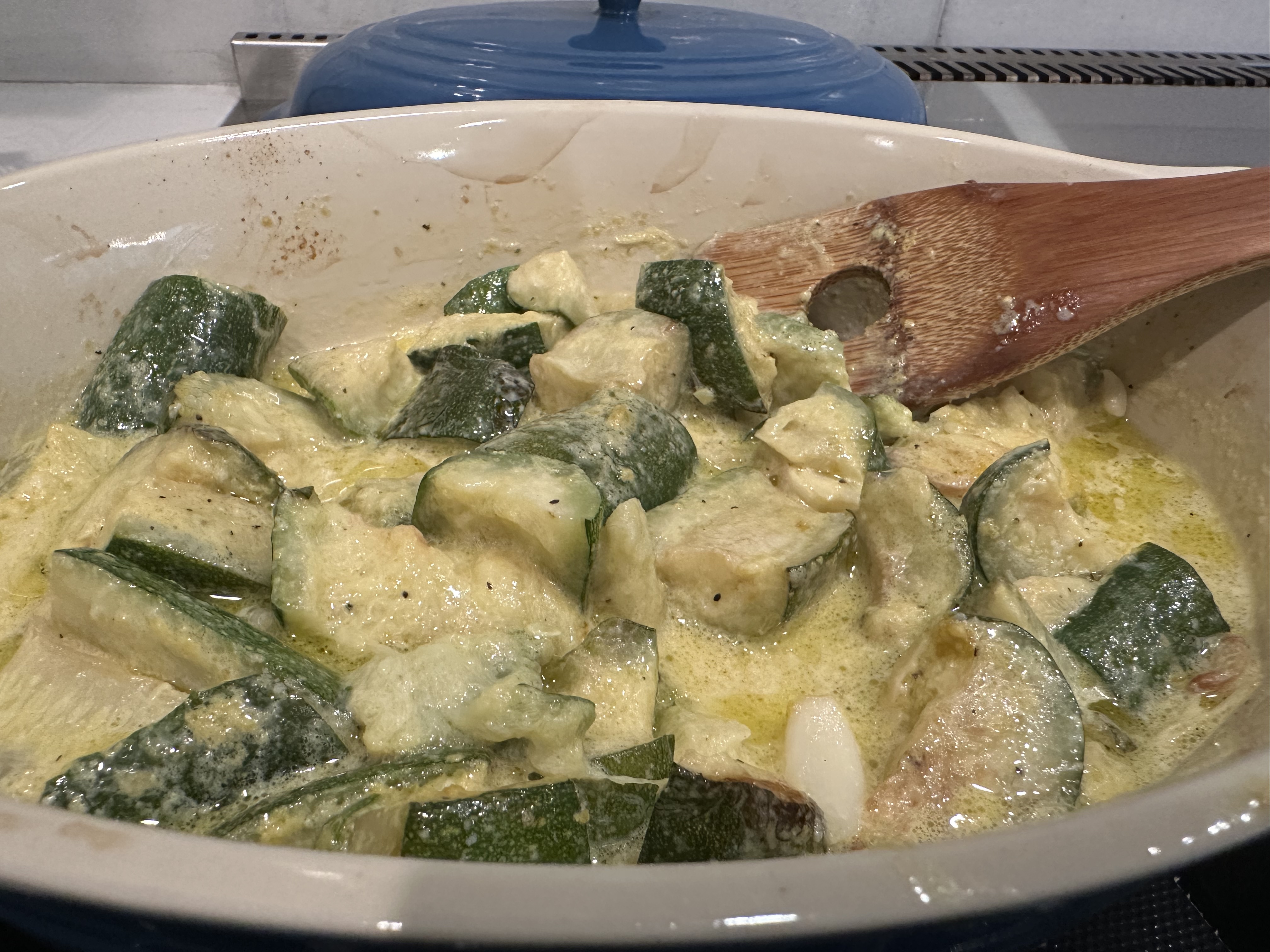 Add them, to an oven-proof dish (with a lid). Add olive oil, cream of choice, lemon juice, salt, pepper, lemon juice and nutritional yeast and mix well.