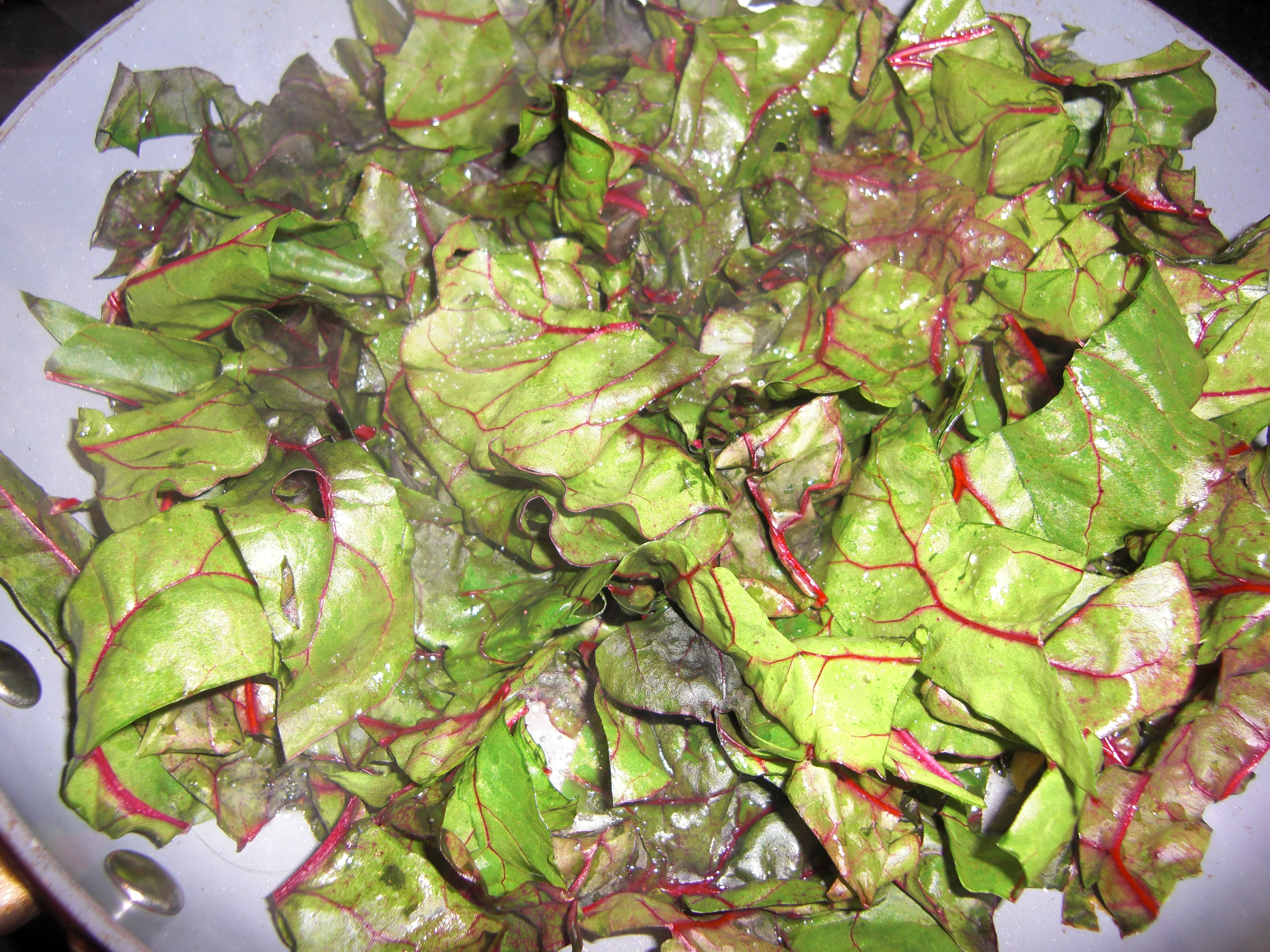 To prepare the chard, start by cutting out the hard pink stalks and chop the rest of the greens into bite sized chunks. Combine the chopped chard with the salt, olive oil, garlic and lemon juice in a bowl. Massage the chard to combine the flavors and soften the leaves. Put into a pan and heat lightly until desired doneness. I prefer mine just lightly wilted. DO NOT heat the olive oil too much because it cannot withstand high heat.