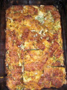 I’ve come across several ‘strata’ recipes lately and wanted to try to convert them to a Maximized Living Nutrition Plans recipe. The cook’s definition for a Strata is : a bread pudding-like layered comfort food casserole made with eggs, cheese and stale cubed bread (or sometimes hash browns). Since regular cubed bread and/or hash browns were out, I decided to substitute Ezekiel bread which would be acceptable on the Core Plan. Certainly, you could leave the bread out all together for the Advanced Plan- it would turn out more like a crustless quiche.