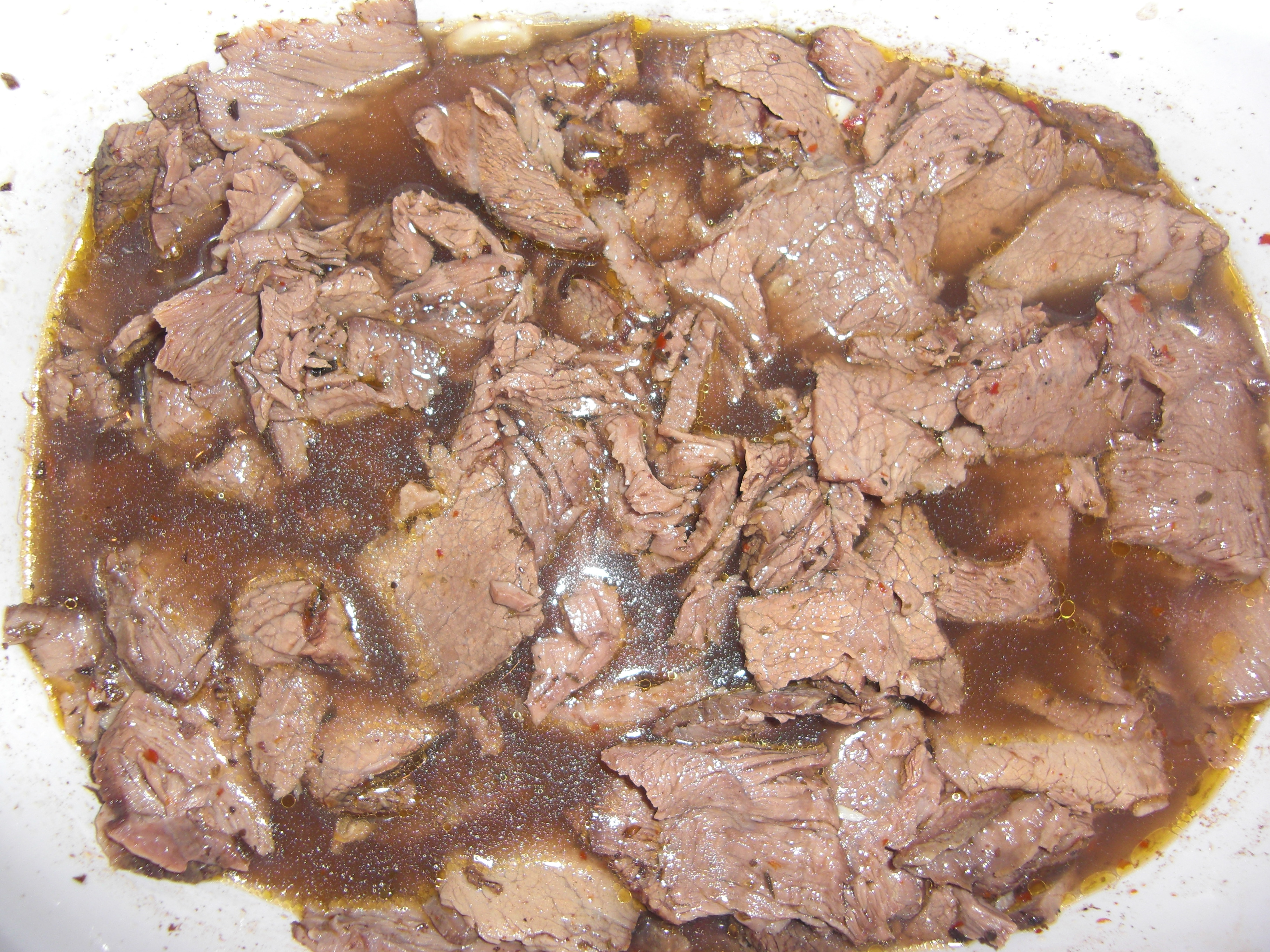 Skim the excess grease from the liquid in the pan and place the sliced beef back in the spicy broth. Let sit for 15 minutes to let the meat absorb the juice.