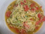 Spiral slice the zucchini and set aside. Heat olive oil to medium heat (never high heat) and add the rest of the ingredients. When warm, add the zucchini and heat through (do not overcook or the zucchini will break down.)