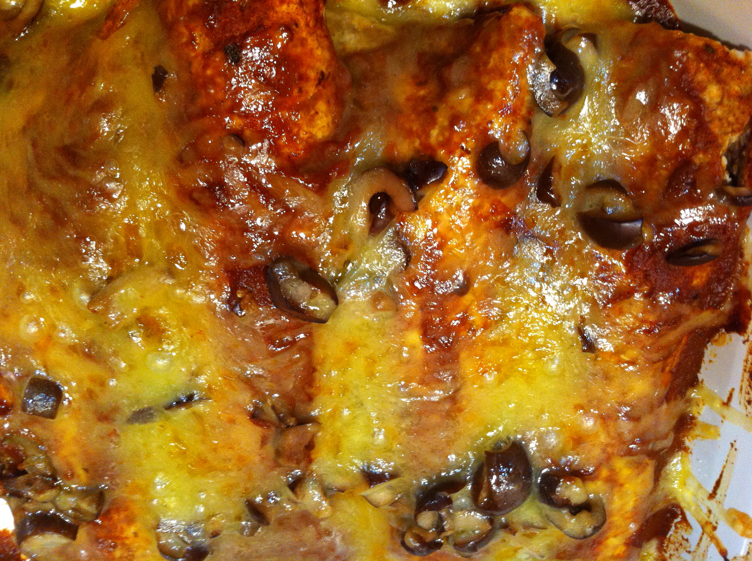 Pour the rest of the enchilada sauce over the top of the enchiladas, sprinkle with remaining olives and top with cheese .