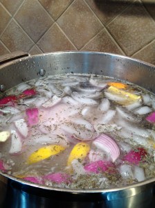 - Place salt, lemons, oranges, onion, garlic, bay leaves, thyme and pepper into a large pot. Place the turkey in the pot, and fill with water and two large bowls of ice. Refrigerate overnight. Discard brine after removing turkey.