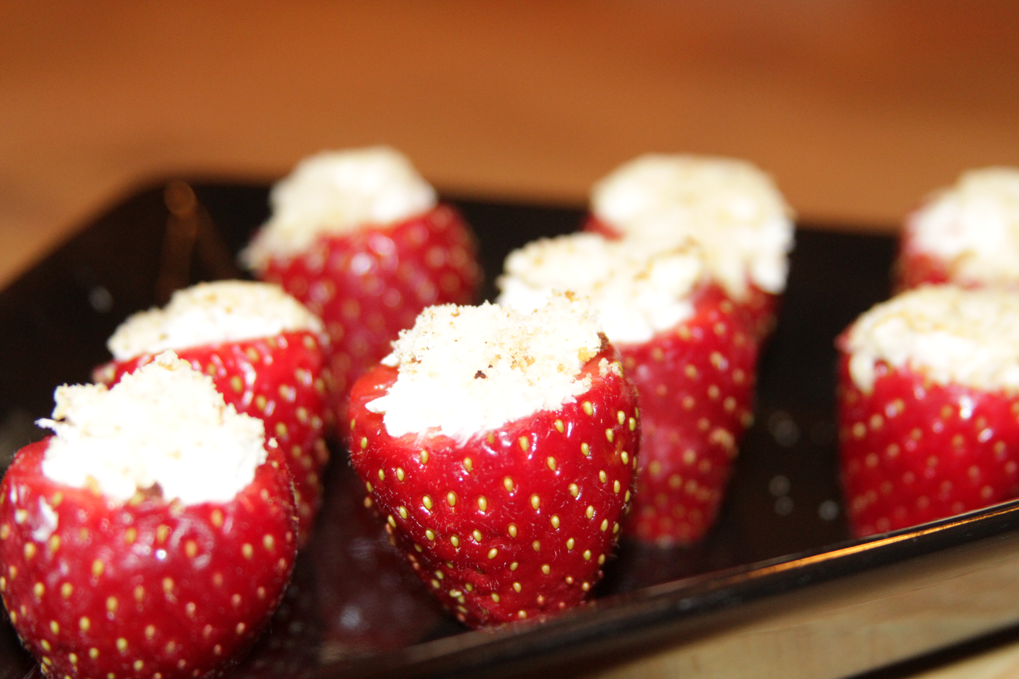 1. Rinse strawberries and cut off the very tip of the strawberry so that it will stand up.  Remove the green top and scrape out a hole with a paring knife. .  Prep all strawberries and set aside.