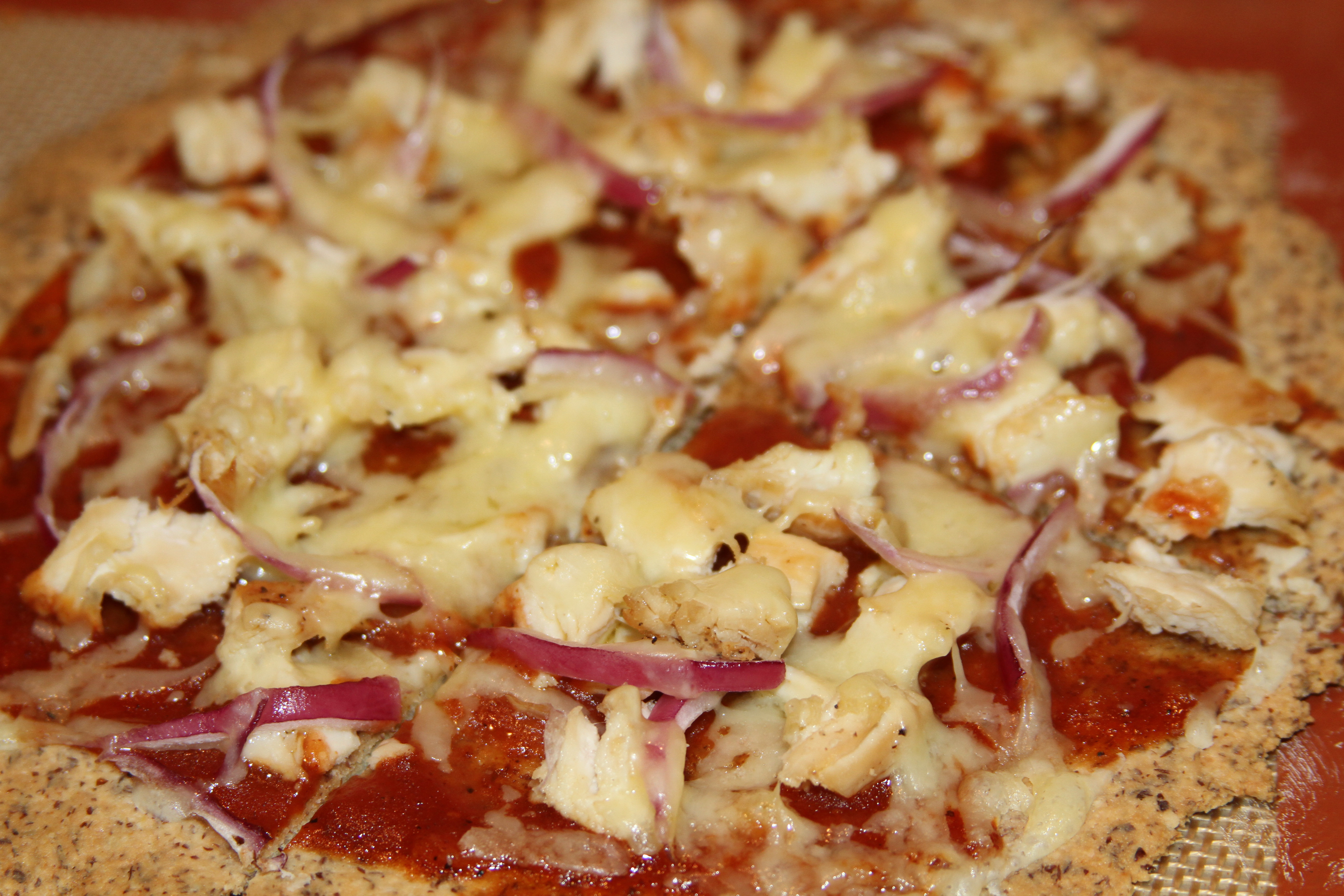 Prepare Almond Flaxmeal Crust and cook according to directions. Prepare homemade barbeque sauce. Spread barbeque sauce on crusts and top with chicken, onion, and cheddar cheese.
