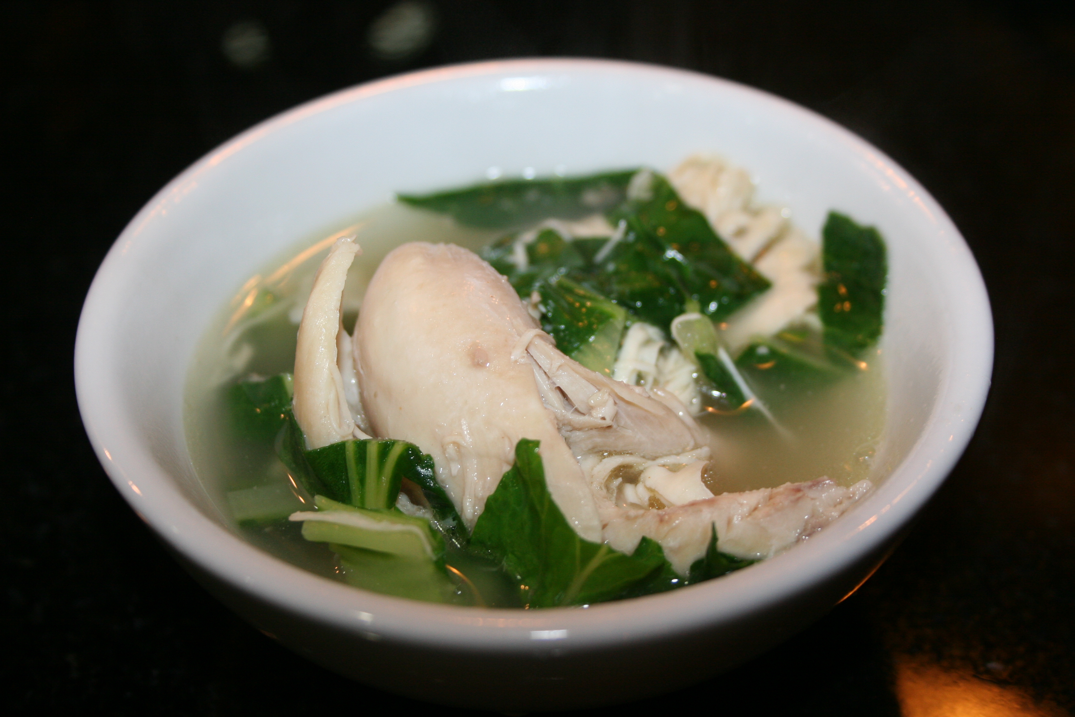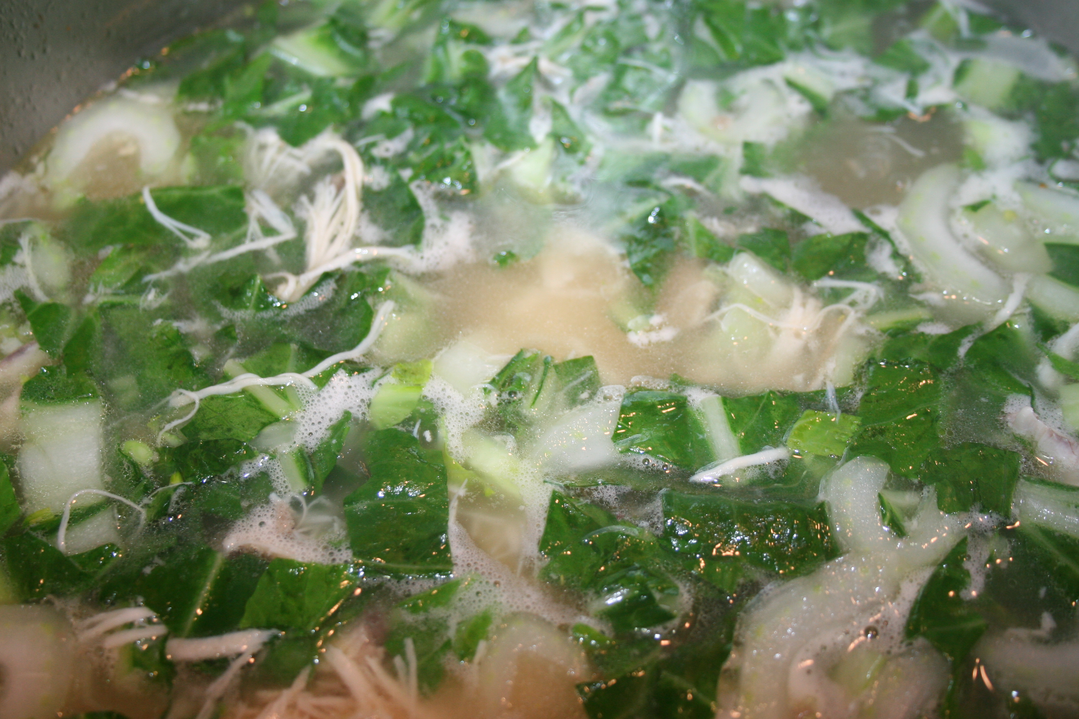 When chicken is cool enough to handle, remove all of the meat from the bones trying to keep the pieces in large chunks. Add back in with the broth and re-heat at medium-high heat until it begins to boil. Add in the bok choy and cook for 5-6 minutes. Add more sea salt and pepper if desired. Serve.