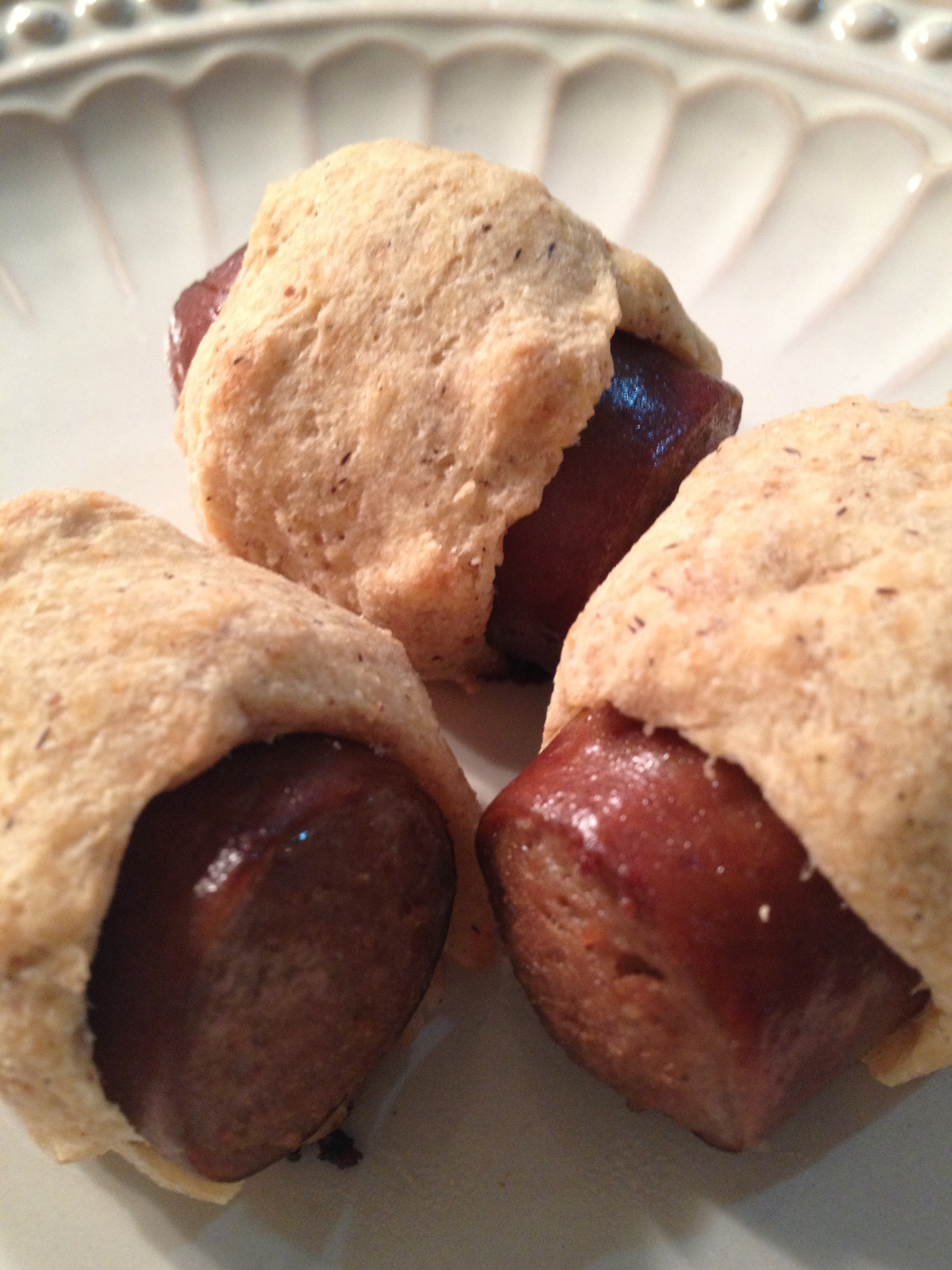 I had to put pigs and blanket in parentheses because it is not the typical “pig” (our nutrition plans exclude pork) and uses beef or chicken instead. The “blankets” which are usually packaged crescent rolls loaded with refined flours bad fats and lots of additives/preservatives are replaced with a fiber-rich, flourless dough.