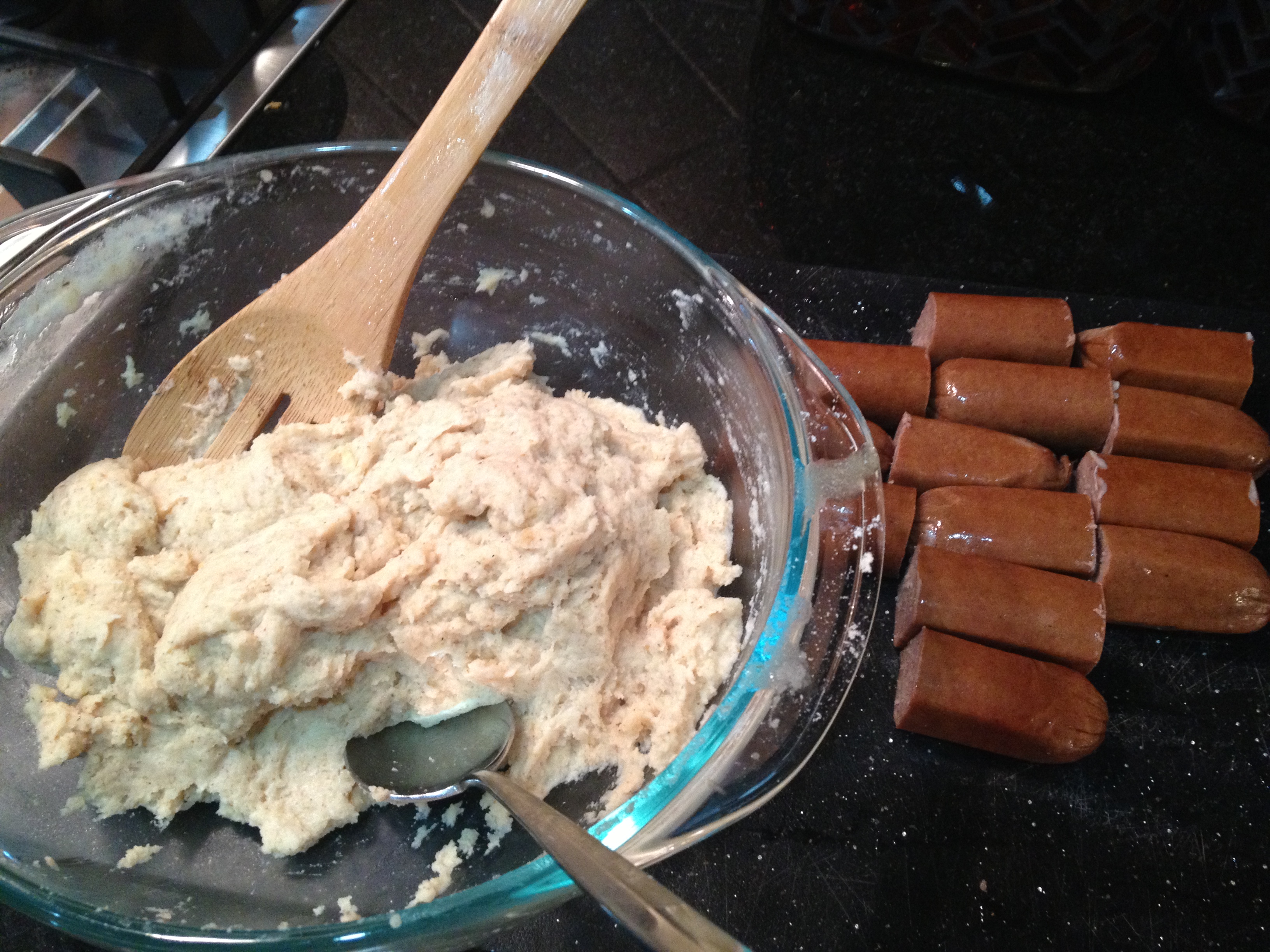 Heat oven to 350 degrees. Combine coconut flour, phsyllium husk powder and salt. Start boiling water and melt butter. Add melted butter to flour mix and stir continuously. Pour in boiling water while stirring dough. Once dough forms move quickly and pinch 1 tablespoon sized pieces of dough, using your fingers, flatten the dough and form it around the meat. Place on a parchment lined baking sheet. Bake for 20 minutes until dough is puffy and golden.