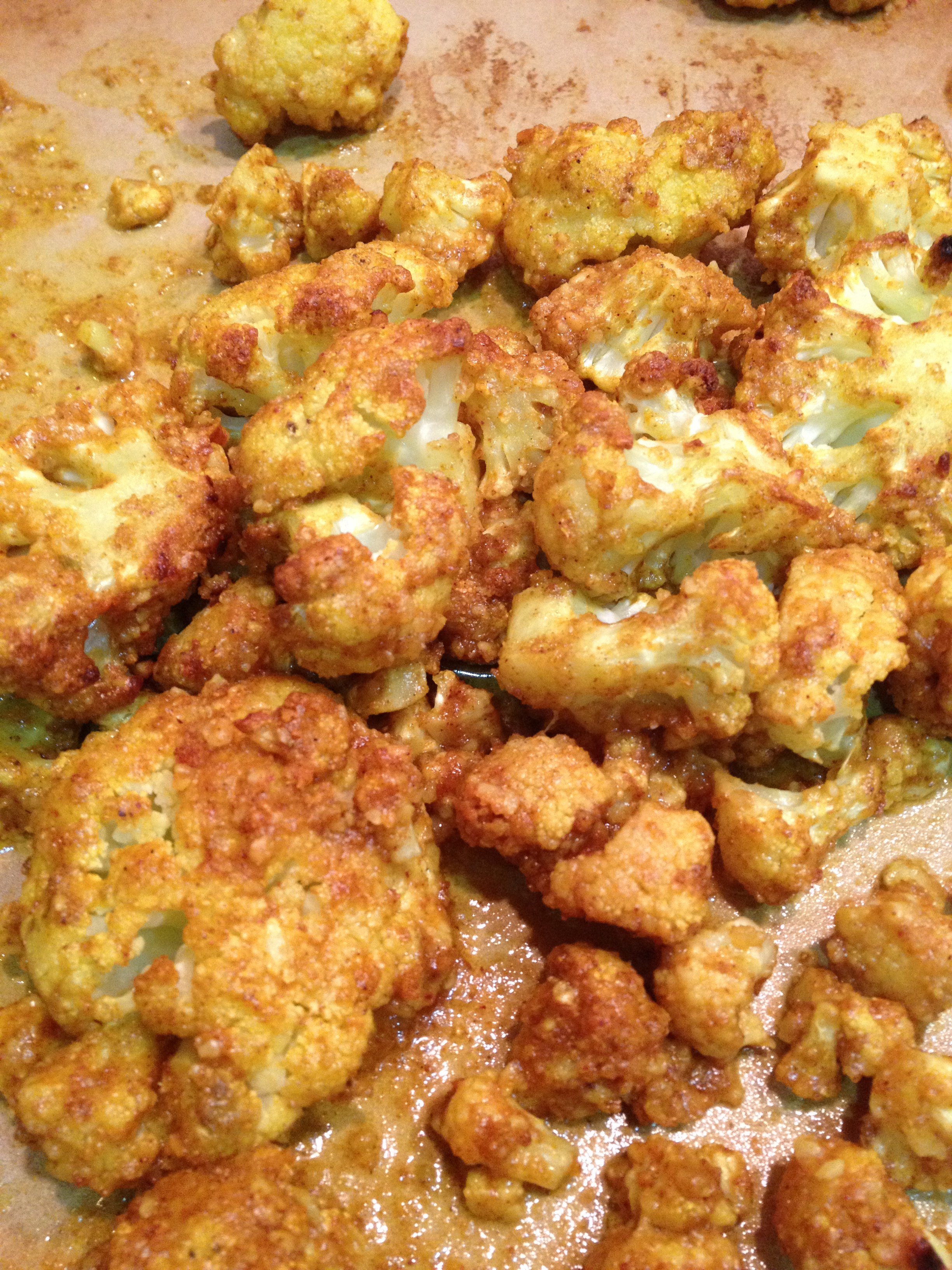 Whisk together the nut butter, curry powder, olive oil and salt. Add florets and mix to coat. Spread out on a baking sheet or cooking stone and put under the broiler (4-5 inches from the heat). Cook for 8-10 minutes until tender and golden brown.