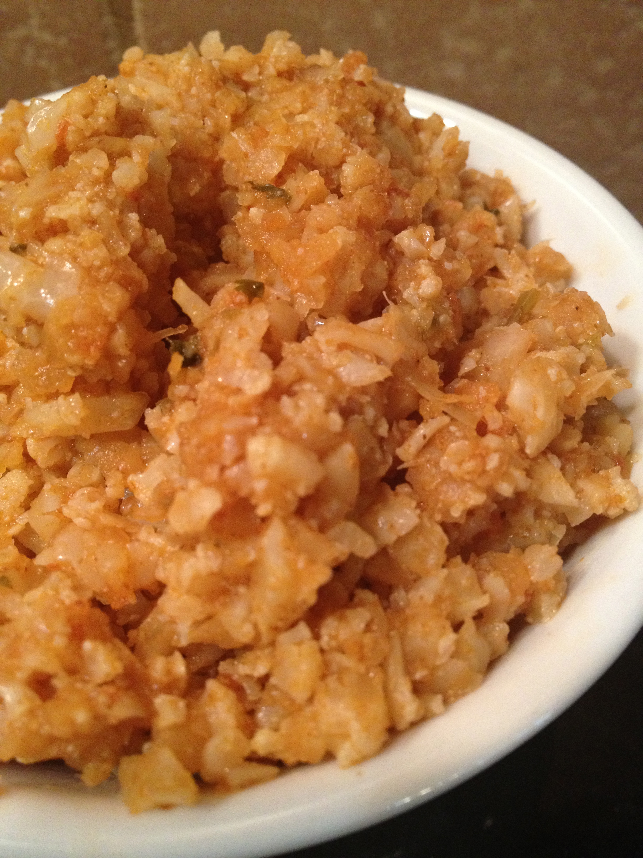 Heat coconut oil in a non-toxic skillet until melted. Add onion and garlic and sauté for 2-3 minutes or until soft. Add cauliflower, cumin, chili powder, salt, chicken stock, and salsa. Simmer until most of the liquid is boiled off and the cauliflower is cooked through. (The finished product will be a little firmer than regular rice).