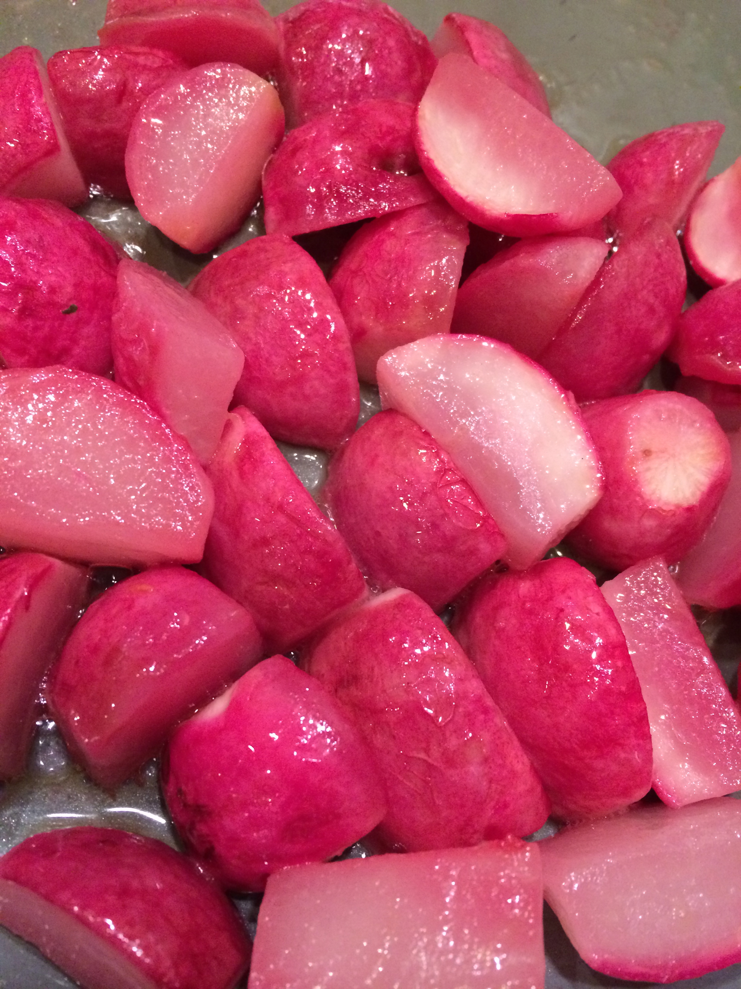 Preheat oven to 450°F. Drizzle olive oil over the bottom of a glass baking dish. Cut radishes lengthwise in half or in fourths if they are large and place in the baking dish. Sprinkle lightly with coarse salt and use your hands to mix everything. (try to get as many of the red skins facing up as possible. Roast until radishes are crisp-tender, stirring occasionally, about 18 minutes. Season tmore coarse kosher salt, if needed.