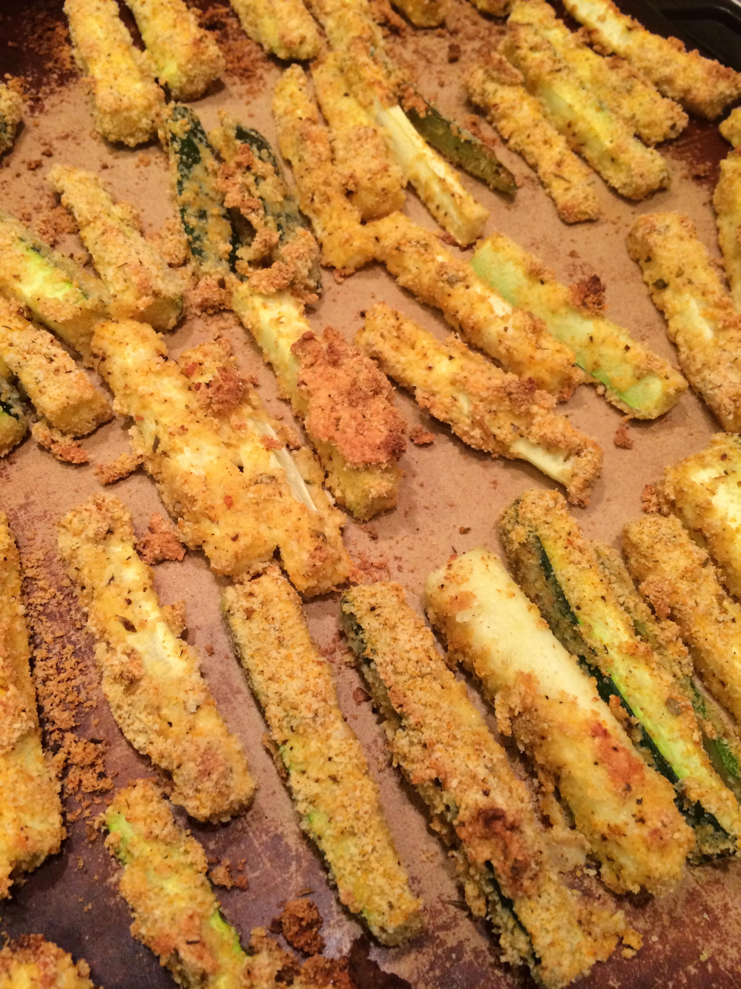 Dip a small handful of zucchini fries in the egg and dredge in the almond flour mixture. Be sure they are well coated and place on a baking stone or parchment lined baking sheet.