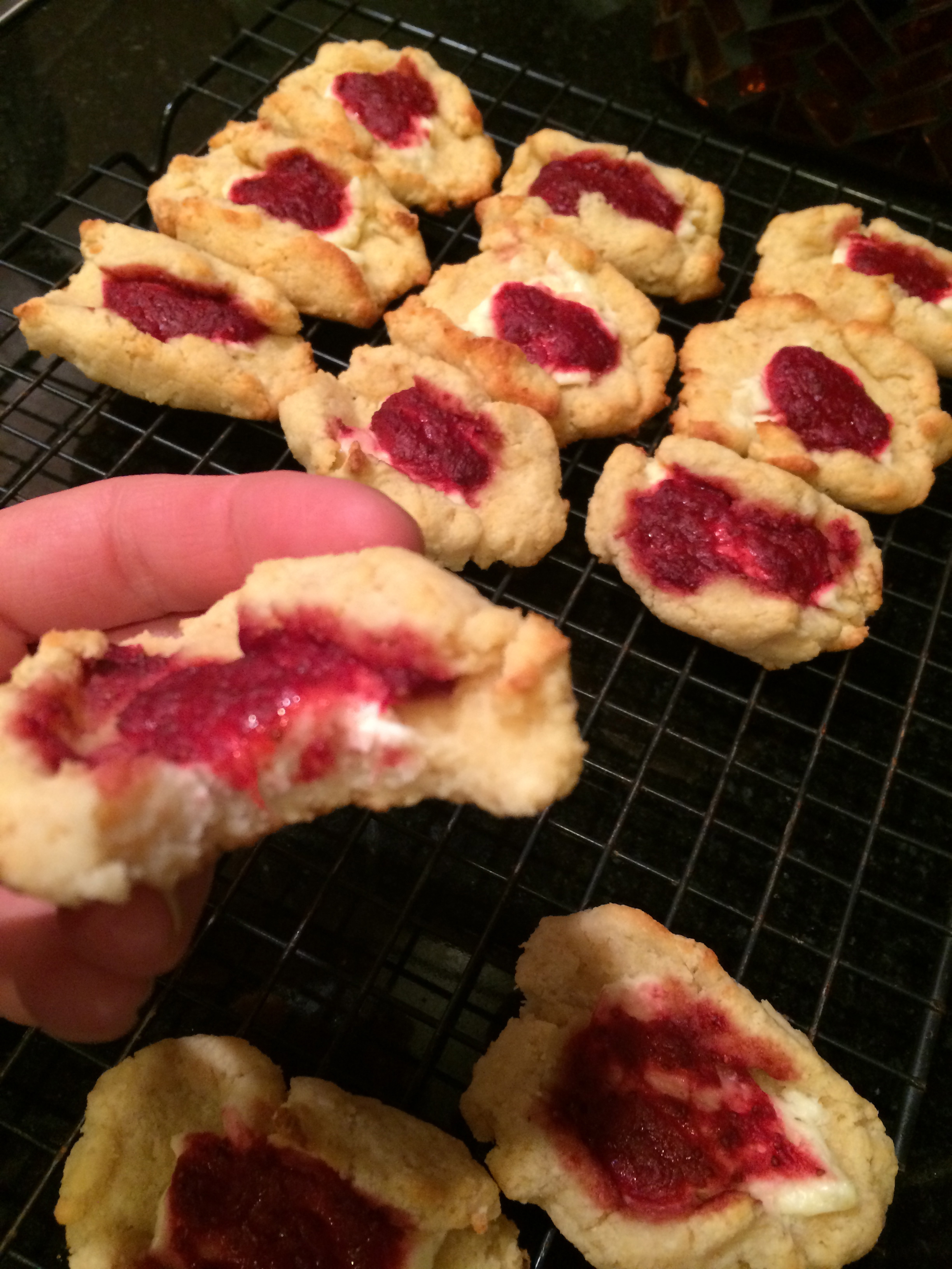 Roll and flatten into a 2 inch oval and place on parchment lined baking sheets. Add a dollop of cream cheese and top with a small spoonful of strawberries. Fold up the edges.