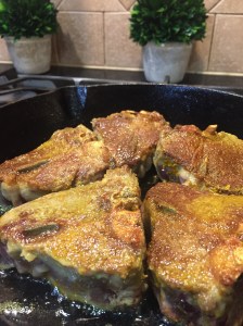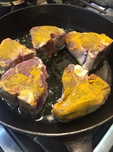 Heat oil in a large cast iron (or other non-toxic skillet) (I love cooking with cast iron- if you don’t know the ins or outs of cooking w/ cast iron, google it). Sprinkle both sides of lamb chops generously with sea salt, cumin, smoked paprika, black pepper and turmeric. Sprinkle less generously with coriander and nutmeg.