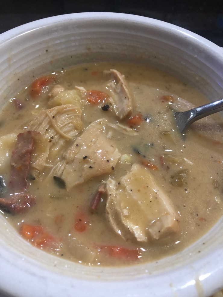 Manually release the valve to venting and let the pressure release. Open the lid and set back to sauté. Whisk the cream and egg yolks together in a small bowl and slowly add a ladleful of broth from the pot to temper the eggs. Be sure to whisk the whole time. Add the mixture to the pot and cook for 2-3 more minutes until broth has thickened a bit. Turn your Instant Pot off and add additional seasoning if desired.