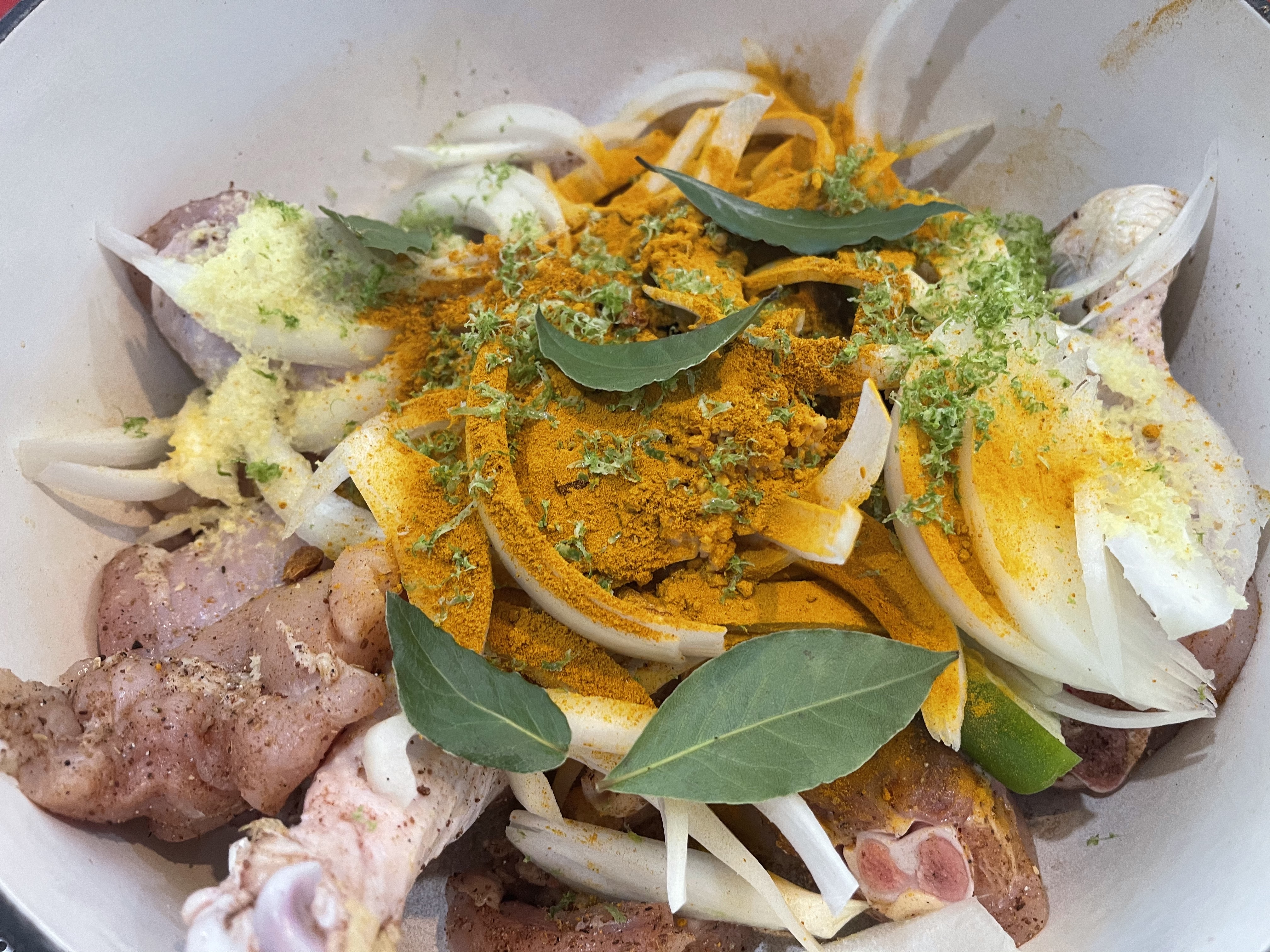 Prepare the marinade by adding the onion, Serrano chiles, garlic, ginger, coriander, paprika, turmeric and curry leaves or lime zest or bay leaves to the pot and combining well until the chicken is evenly coated. Cover and chill at least 30 minutes or 12 hours.