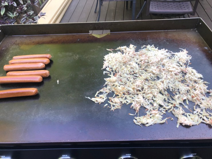 lettuce, tomato, chopped red onion, fried free range egg, pickles, etc.